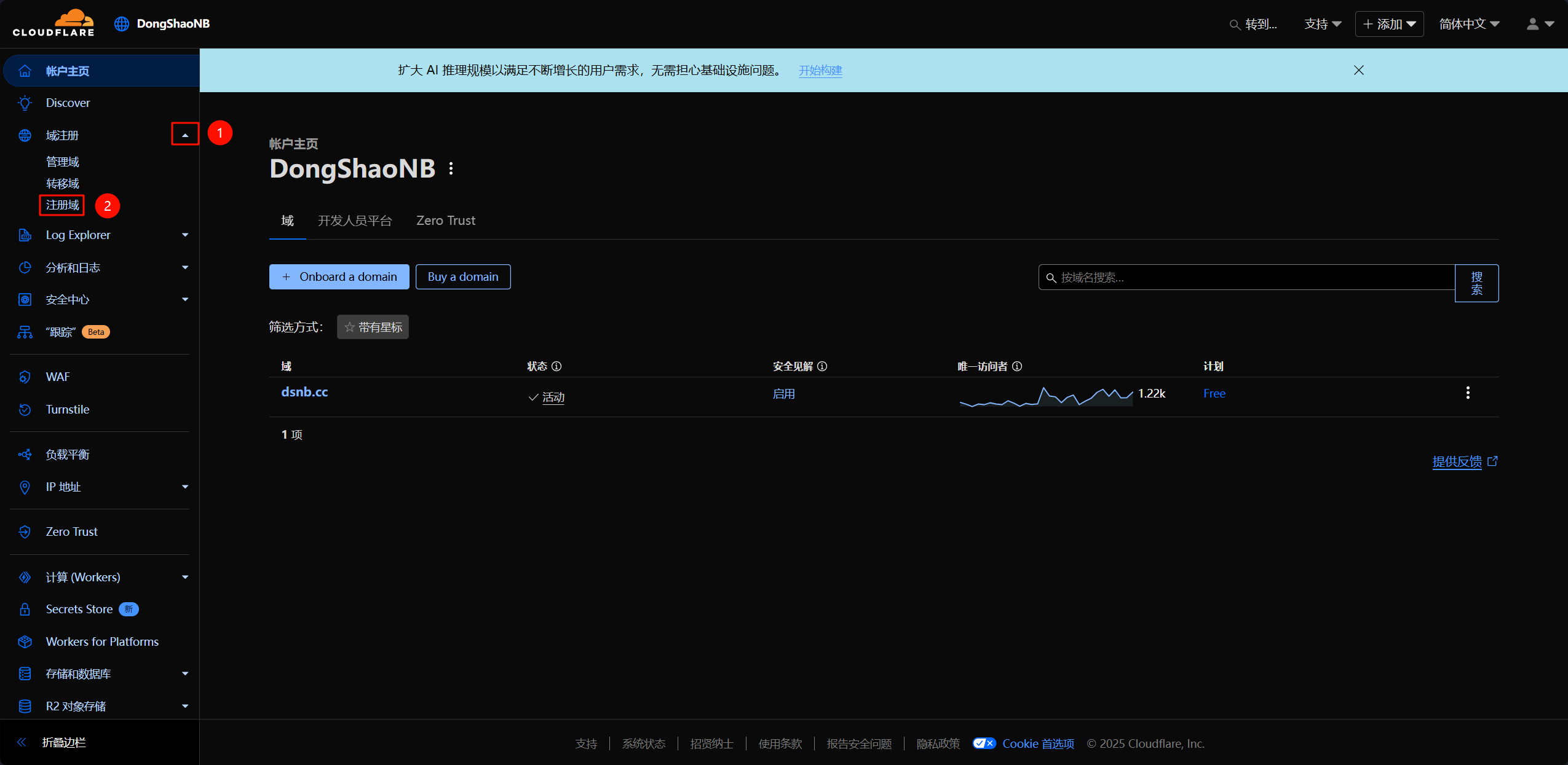 首先,你需要把域名添加到 Cloudflare,点击左侧账户主页 - Onboard a domain,输入已在其他服务商注册的域名
