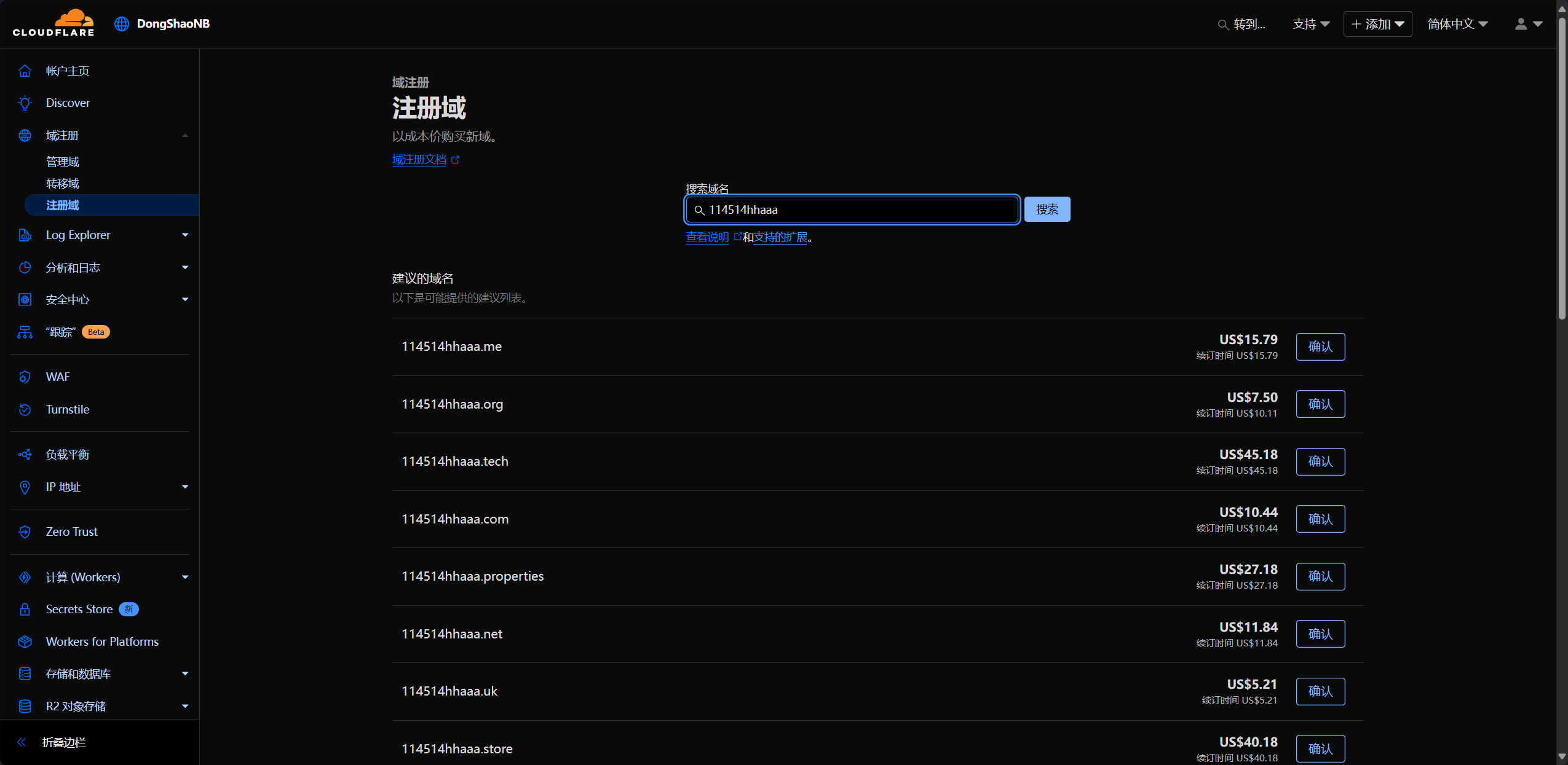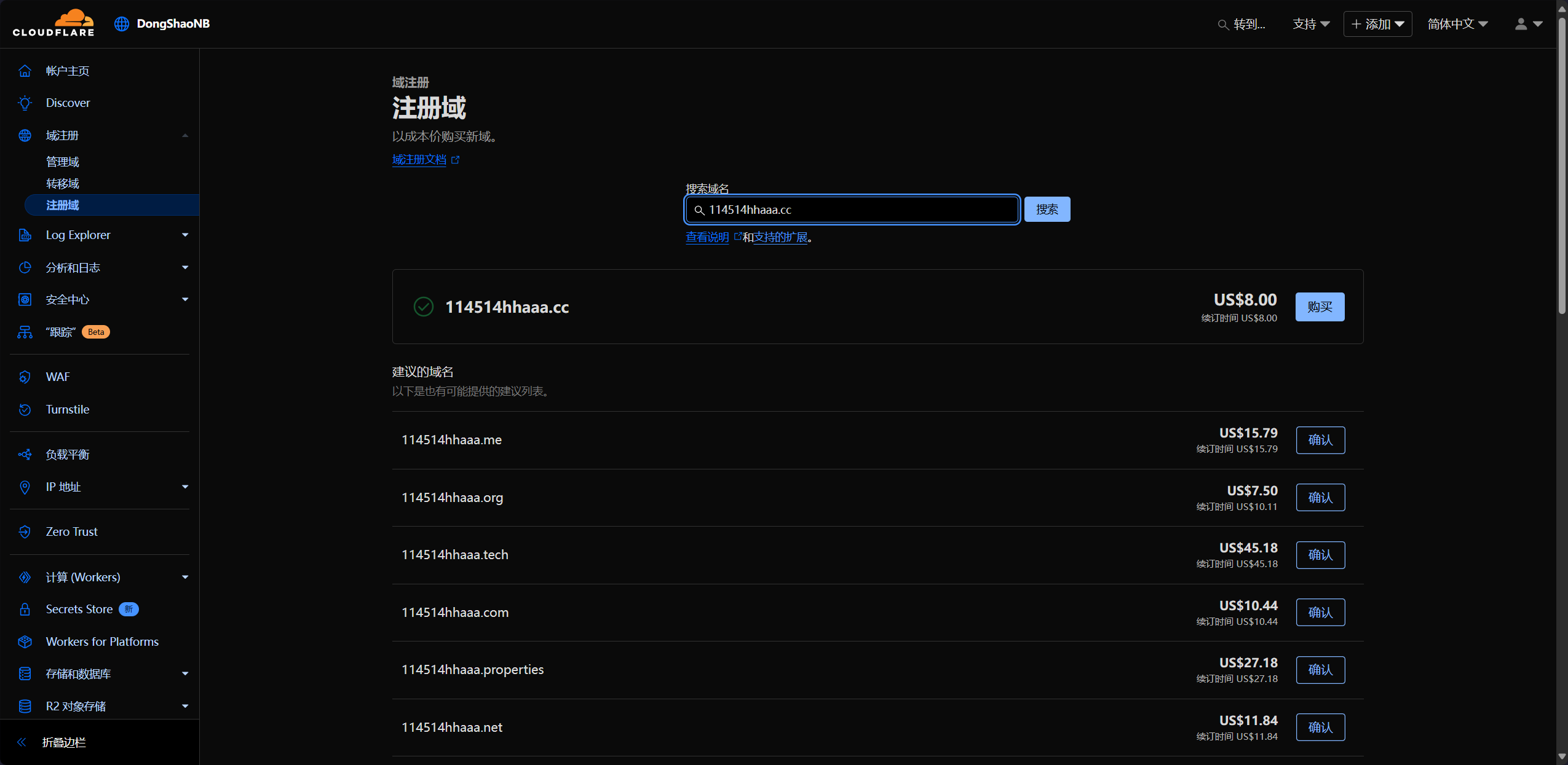 输入你想要注册的域名,比如 114514hhaaa,点击搜索,会出现建议的域名,这里只展示了部分顶级域名,如果你需要指定顶级域名,比如 .cc,则在搜索框后添加 .cc,搜索 114514hhaaa.cc,即可查看是否可用并注册