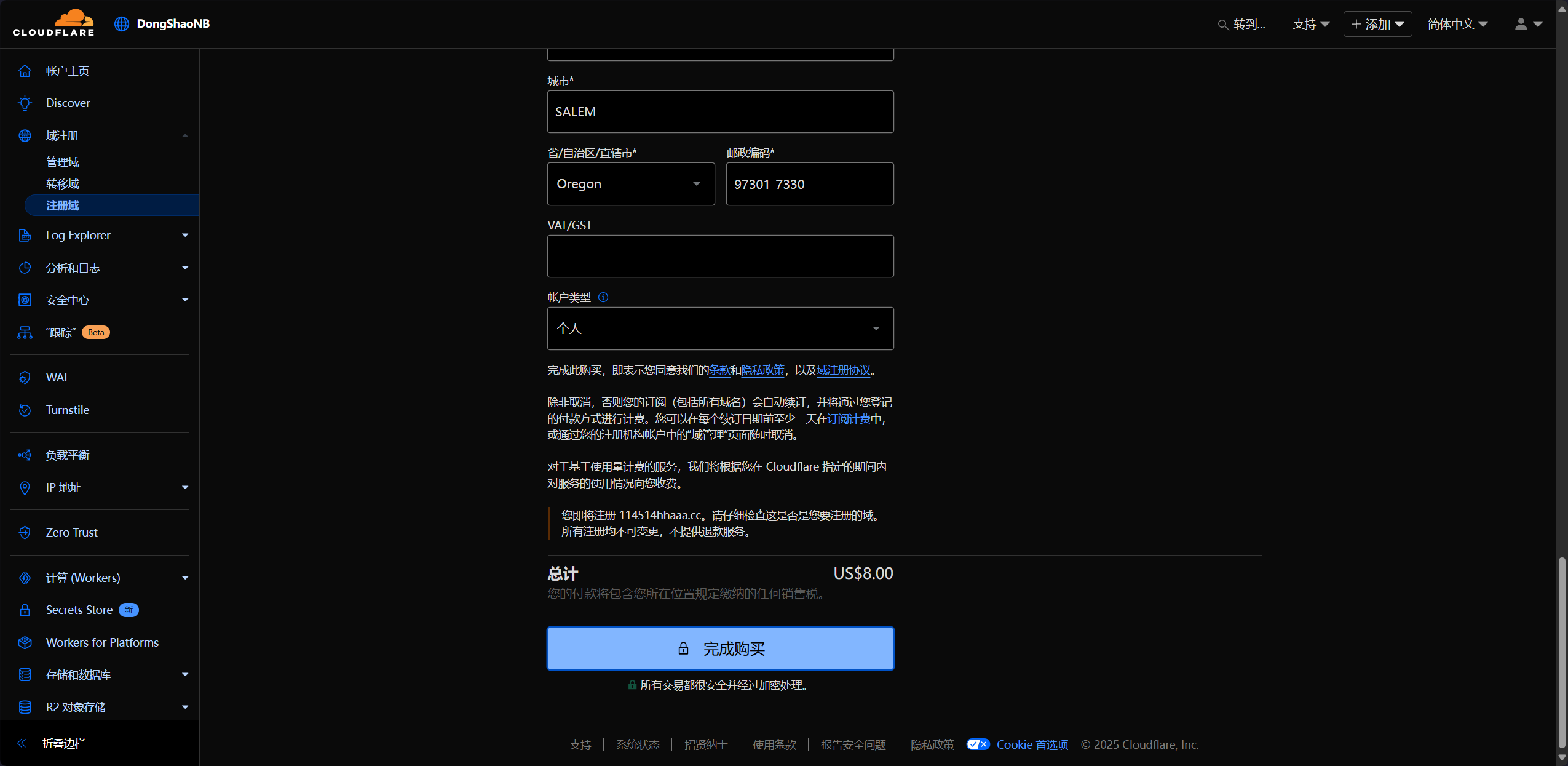 确定要注册的域名后,点击右侧的购买/确认,在注册信息页面,姓名地址电话等信息随意填写即可,无关紧要(不清楚国外的卡要不要填写正确信息,反正帖主是随便填了个美国地址)