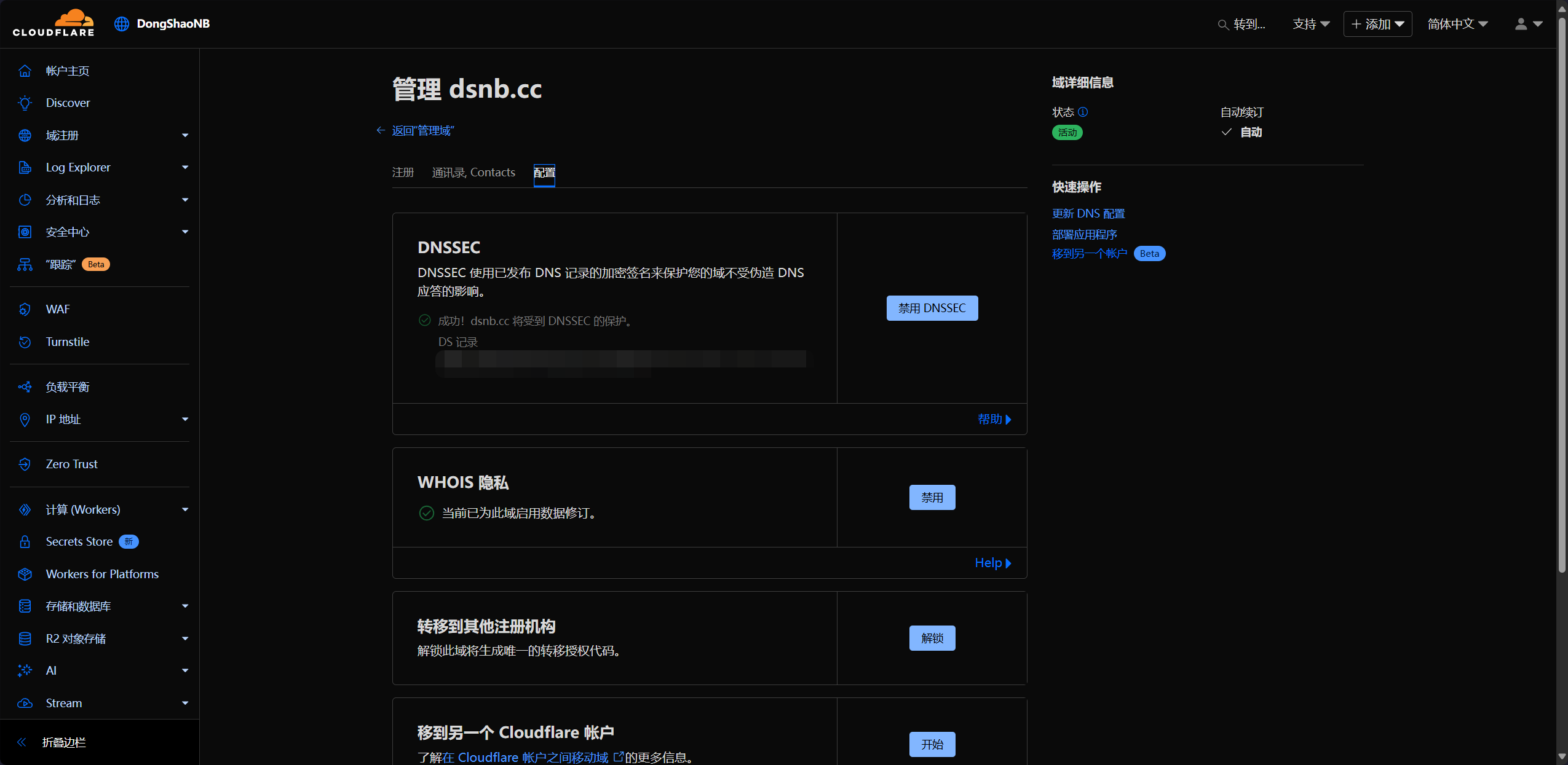 点击继续,当 Cloudflare 检测到 NameServer 已修改后(也可以手动点击“立即检查名称服务器”按钮),即可在 Cloudflare 上开始转移域名